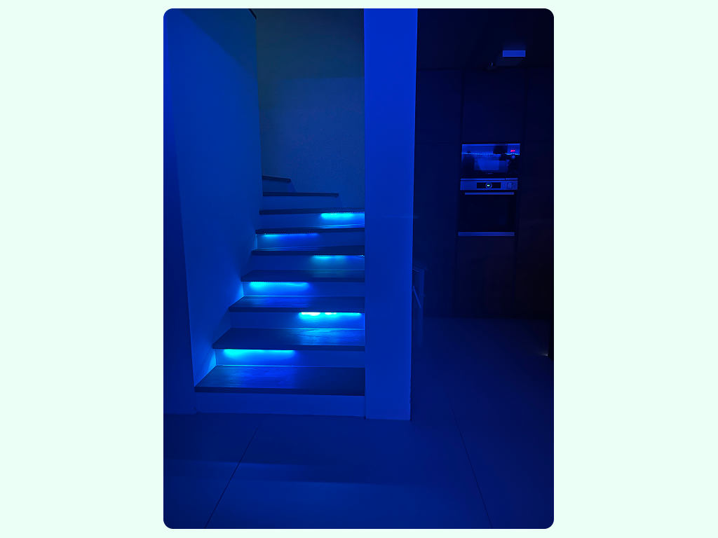 Ob gradnji nove hiše smo se odločili, da bomo po stopnicah namestili LED trakove, ki se prižgejo ob zaznanem gibanju. Ker takega izdelka ni bilo na trgu, sem rabil razviti tako elektronsko kot programsko rešitev. Projekt pa dopolnjuje še aplikacija za nadzor in nastavitev.