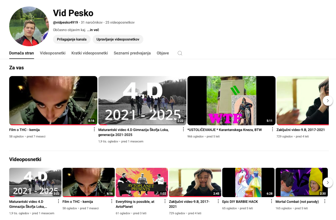 Že od osnovne šole se ukvarjam z snemanjem in fotografiranjem, ter s nadaljno obdelavo in montažo slik in video posnetkov. Vsa dela objavljam na svoj Youtube kanal.